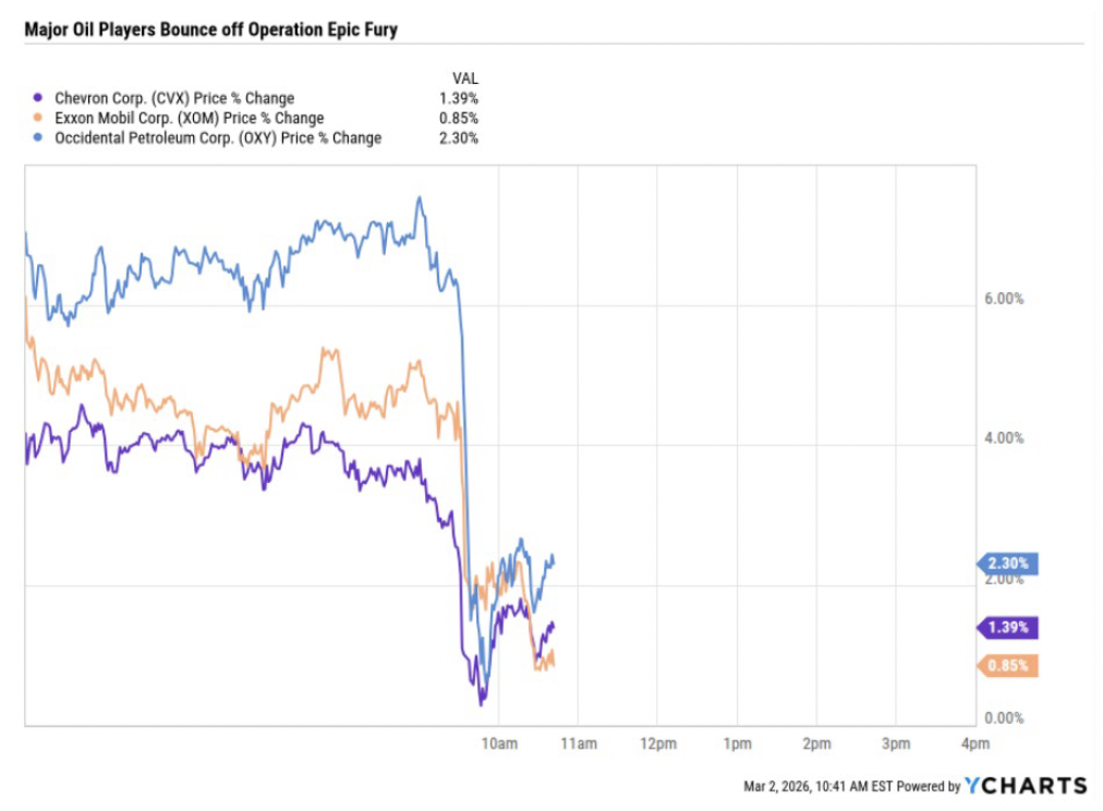 The S&P 500, Dow Jones Industrial Average, and Nasdaq were down as much as 50 bps after the open, but at the time of writing the S&P and Dow were flat to moderately positive with the tech heavy Nasdaq up around 50 bps. As expected, major moves were concentrated in sectors like energy and industrials. Exxon Mobile, Occidental Petroleum, and Chevron were each up approximately 1.50% at the open, but mixed news about the status of the Strait of Hormuz left investors searching for answers, leading to choppy trading.