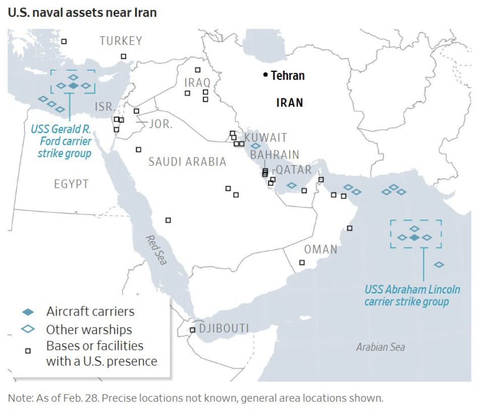 • January 13th, 2026 – President Trump tells Iranians to “keep protesting,” claiming that “help is on the way.” At this point the US begins to bolster its military presence in Iran. Over the course of the next 6 weeks, the United States goes on to build up its largest military presence in the Middle East since the 2003 invasion of Iraq. This includes two aircraft carrier strike groups.