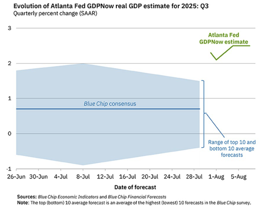Let’s dig a little deeper into the fundamentals.  Keeping it clean, here is an early look at the Atlanta Fed GDPNow forecast for 2025 Q3.  So fresh at +2% coming out of the gates for the current quarter based on the data, once again well ahead of more pessimistic “blue chip” economist expectations at a time when green, green from the Atlanta Fed in the chart below has been getting it right and blue from the economists has been getting it wrong.